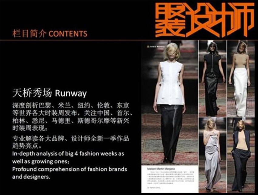 《服裝設(shè)計師》創(chuàng)辦于2001年,月刊,單期218頁,《服裝設(shè)計師》雜志是溝通時裝、時尚業(yè)與衣著消費(fèi)市場的有效傳媒。,是服裝設(shè)計者、經(jīng)營者和采購商、經(jīng)銷商、時尚記者必讀的資訊刊物,是時尚和文化人士衣著消費(fèi)的專業(yè)指南。