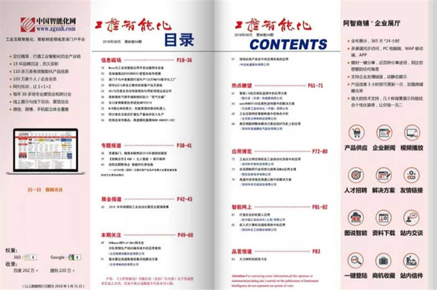 《工控智能化》主要欄目:信息磁場、高管訪談、專題報道、智能化刊中刊、本期關(guān)注、應(yīng)用博覽、熱點(diǎn)瞭望、智能網(wǎng)上、智能化您上、品名悟道等。