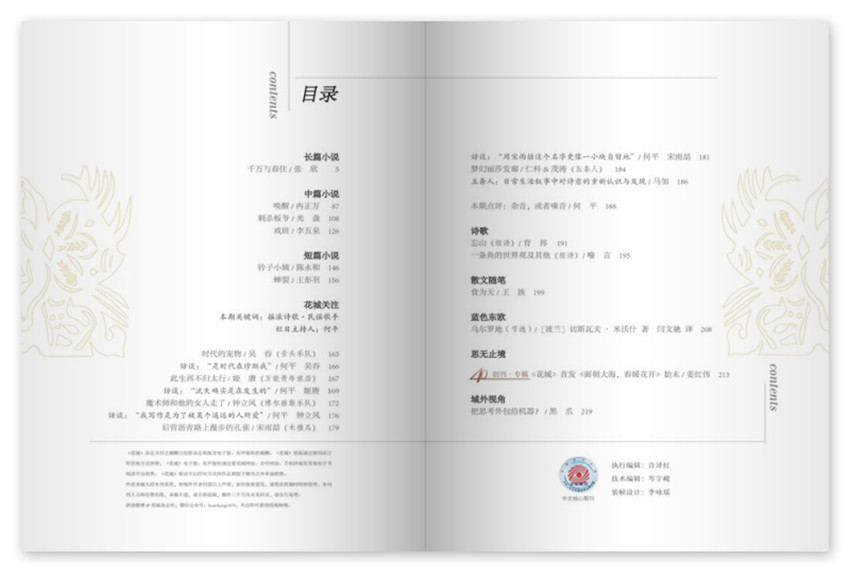 《花城》主要欄目:長篇小說、詩歌、中篇小說、短篇小說、散文隨筆、實驗文本等。