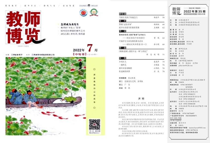 《教師博覽》創(chuàng)辦于1993年,月刊,《教師博覽》作為教育領(lǐng)域權(quán)威期刊,其服務(wù)內(nèi)容豐富、專業(yè)、實(shí)用,既有助于教育工作者聚焦最新進(jìn)展和動(dòng)態(tài),了解學(xué)科最新成果,也有助于源頭提升教研能力和實(shí)踐水平。